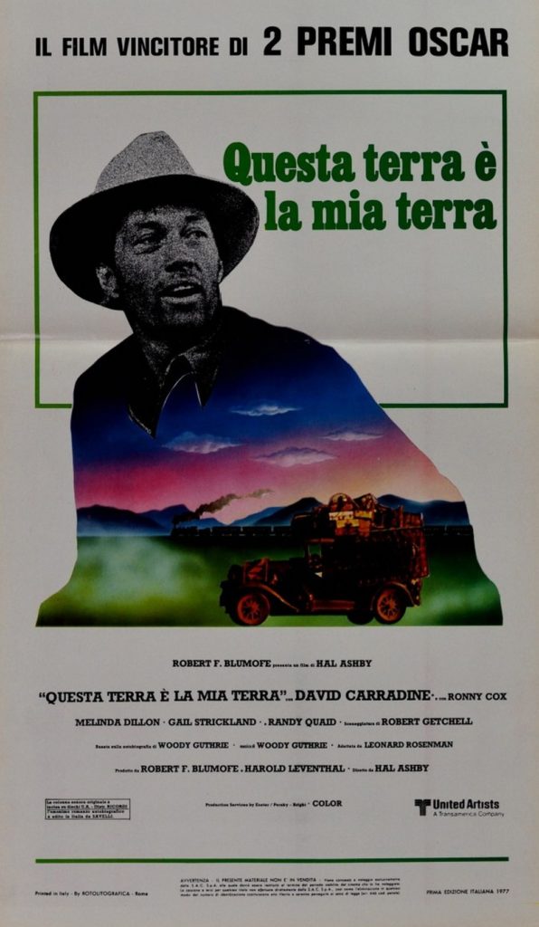 Il 5 dicembre 1976 Questa terra è la mia terra di Hal Ashby, biografia del folk singer girovago Woody Guthrie, negli anni ’30 cantore della classe operaia (qui David Carradine), fa il suo debutto nelle sale degli USA. Per il ruolo principale pare sia stata presa in considerazione mezza New Hollywood; fra i nomi più importanti, quello di Jack Nicholson, che, non sentendosi adatto per la parte, avrebbe indicato Bob Dylan fra i papabili. In effetti, si era puntato pure sui cantanti Kris Kristofferson e Tim Buckley (morto poco prima delle riprese). Steadicam utilizzata in modo innovativo.