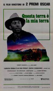 Il 5 dicembre 1976 Questa terra è la mia terra di Hal Ashby, biografia del folk singer girovago Woody Guthrie, negli anni ’30 cantore della classe operaia (qui David Carradine), fa il suo debutto nelle sale degli USA. Per il ruolo principale pare sia stata presa in considerazione mezza New Hollywood; fra i nomi più importanti, quello di Jack Nicholson, che, non sentendosi adatto per la parte, avrebbe indicato Bob Dylan fra i papabili. In effetti, si era puntato pure sui cantanti Kris Kristofferson e Tim Buckley (morto poco prima delle riprese). Steadicam utilizzata in modo innovativo.